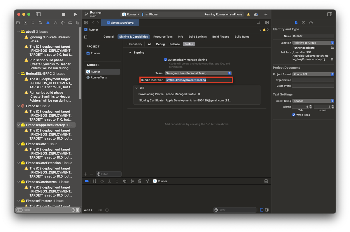 여기서 Bundle Identifier가 유일하지 않기 때문에 에러가 발생한다. 이걸 전 세계에서 유일한 문자열로 만들어줘야 한다.